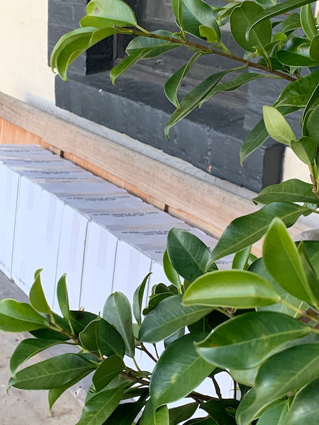 Our wine labels are designed and screen-printed individually by hand by Danielle. This removes the need to use paper for labels and by screen printing on site, we reduce the amount of truck transport required each vintage. Glass packaging with a printed label directly onto the bottle is an eco-friendly option reducing energy use, labour, transport, paper and glue, reducing its environmental impact.